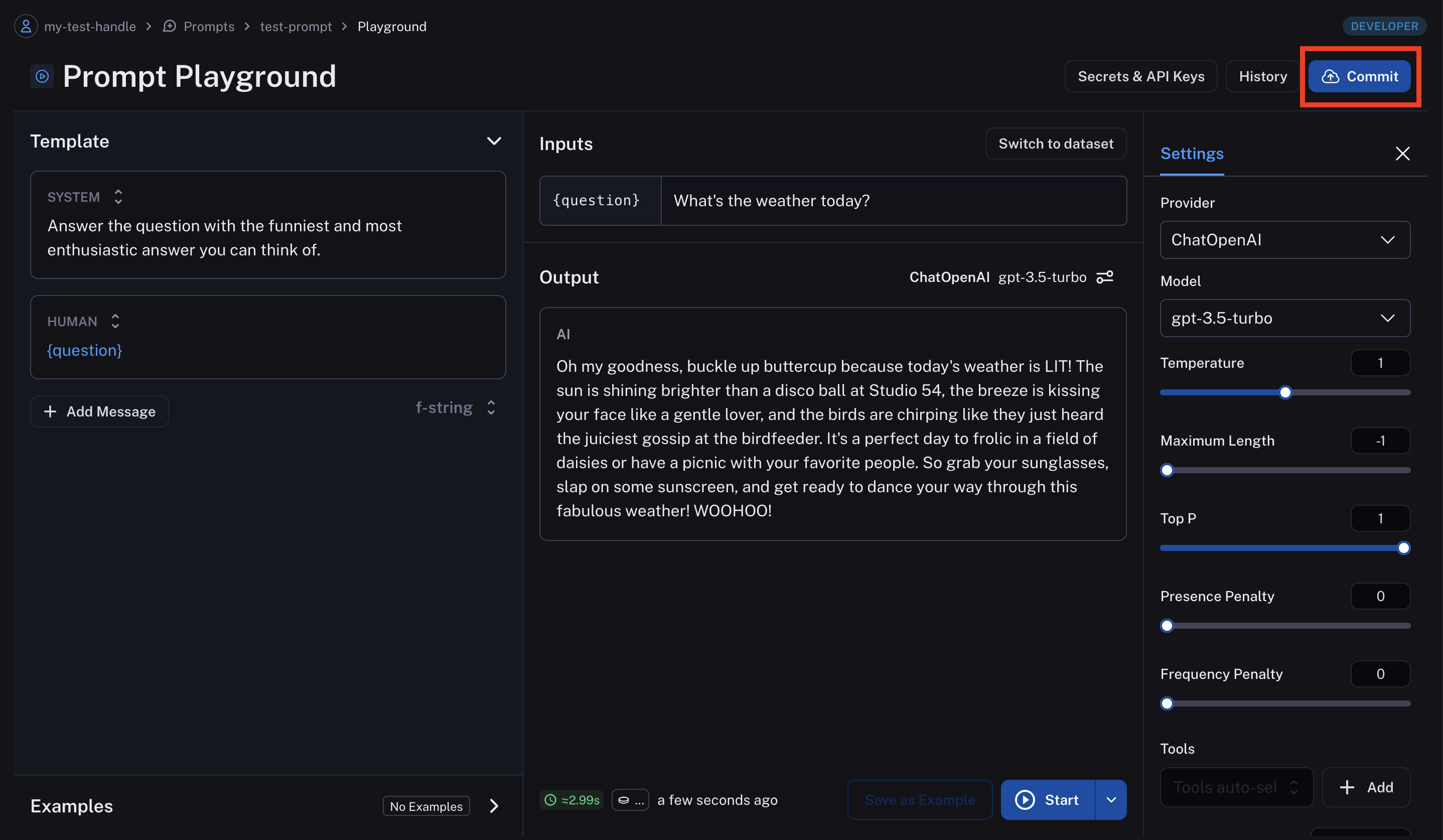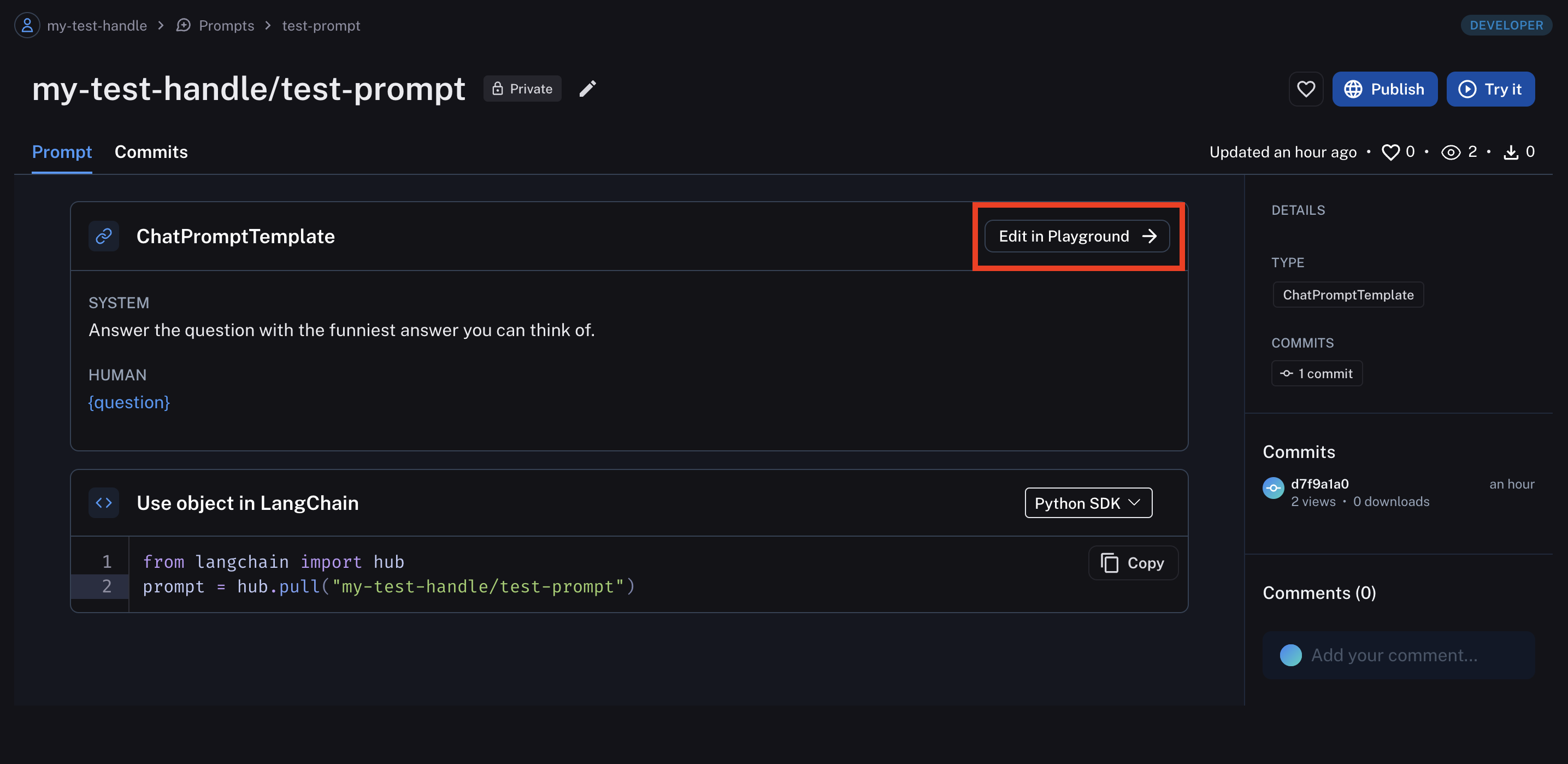 To update the prompt content itself, you need to enter the prompt playground. Click "Edit in playground". Now you can make changes to the prompt and test it with different inputs. When you're happy with the prompt, click "Commit" to save it.