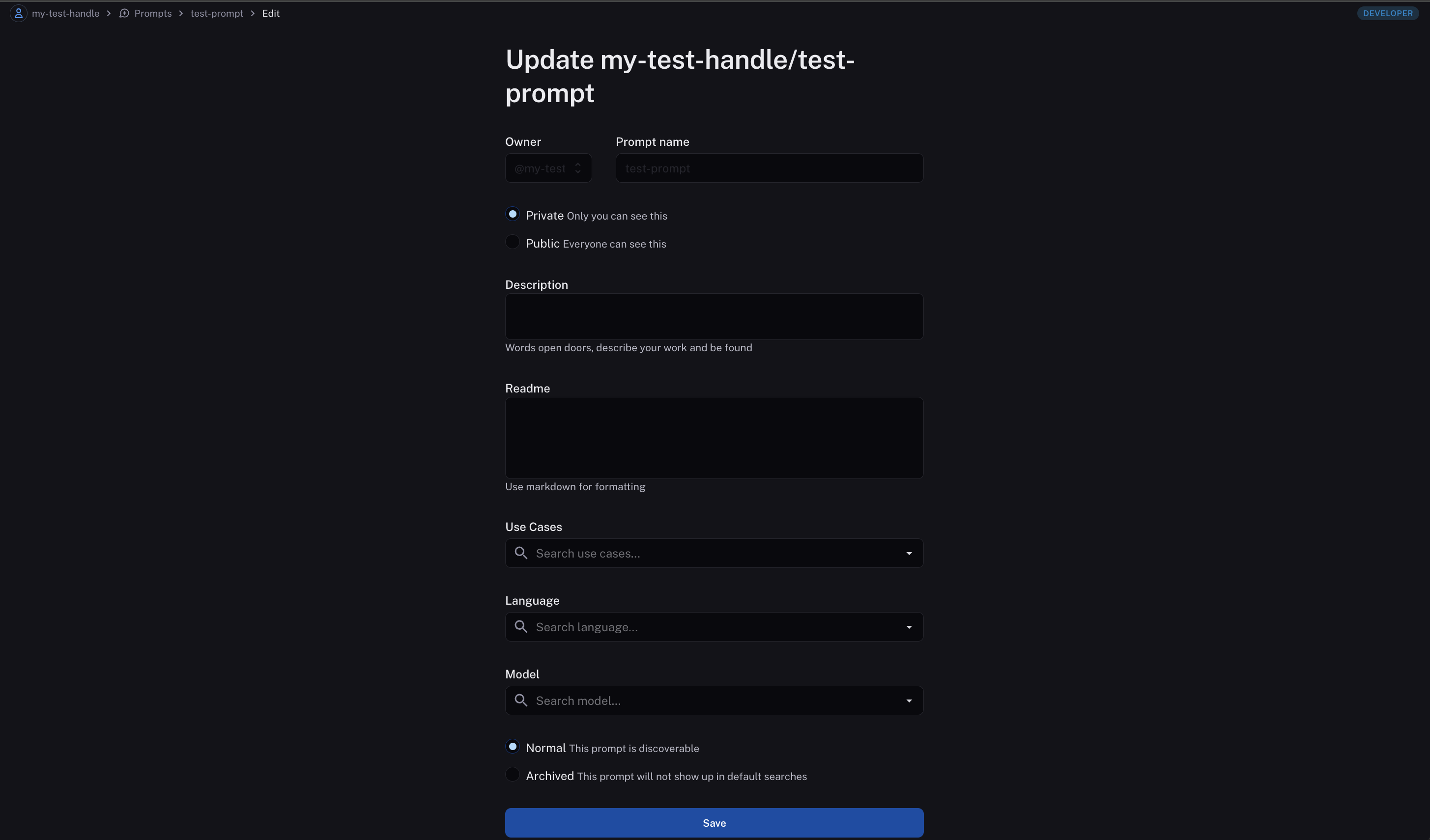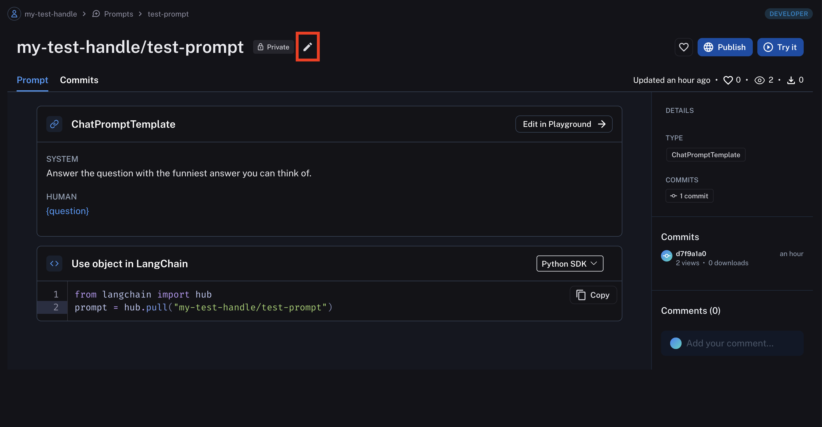 To update the prompt metadata (description, use cases, etc.) click the "Edit" pencil icon.