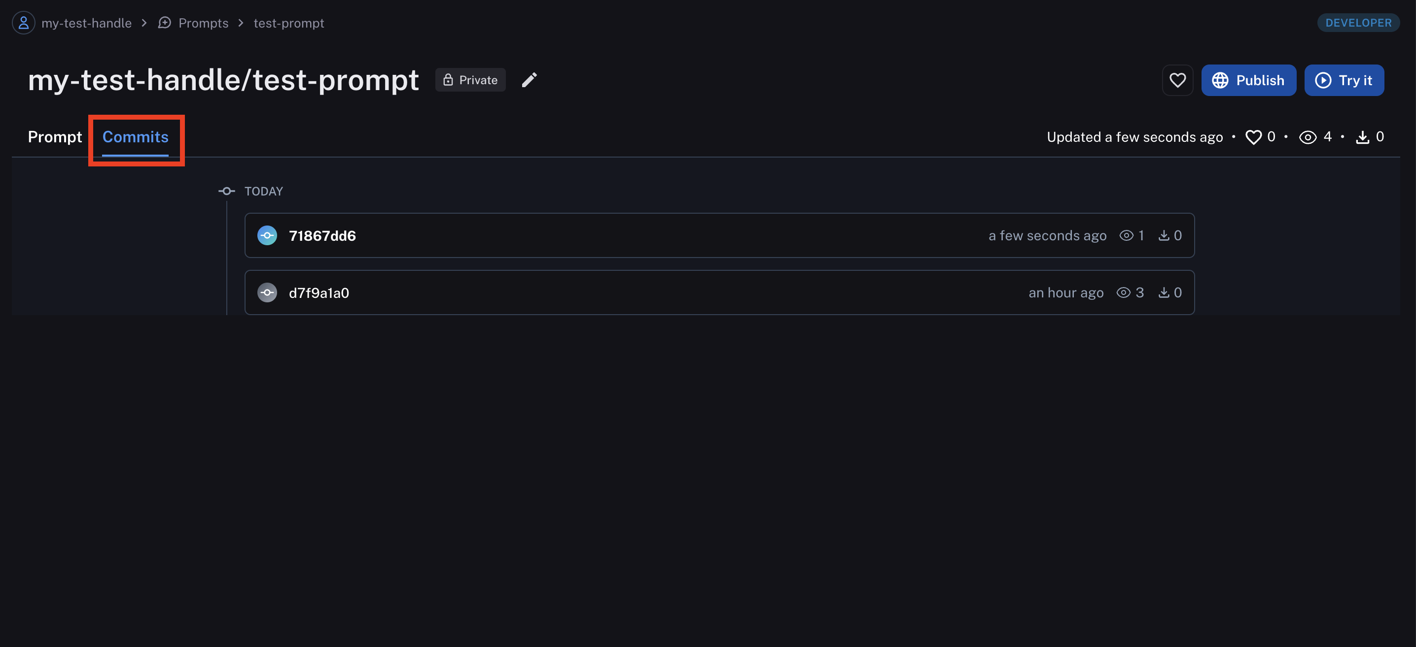 When you add a commit to a prompt, a new version of the prompt is created. You can view all historical versions by clicking the "Commits" tab in the prompt view.